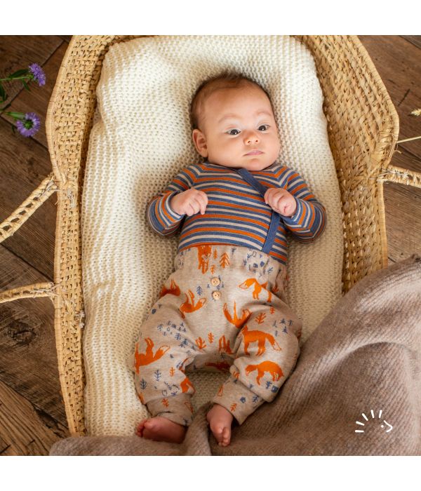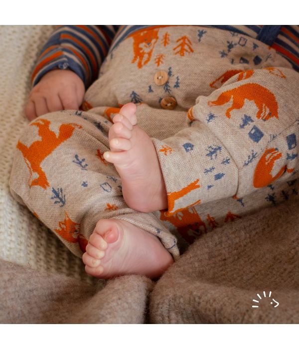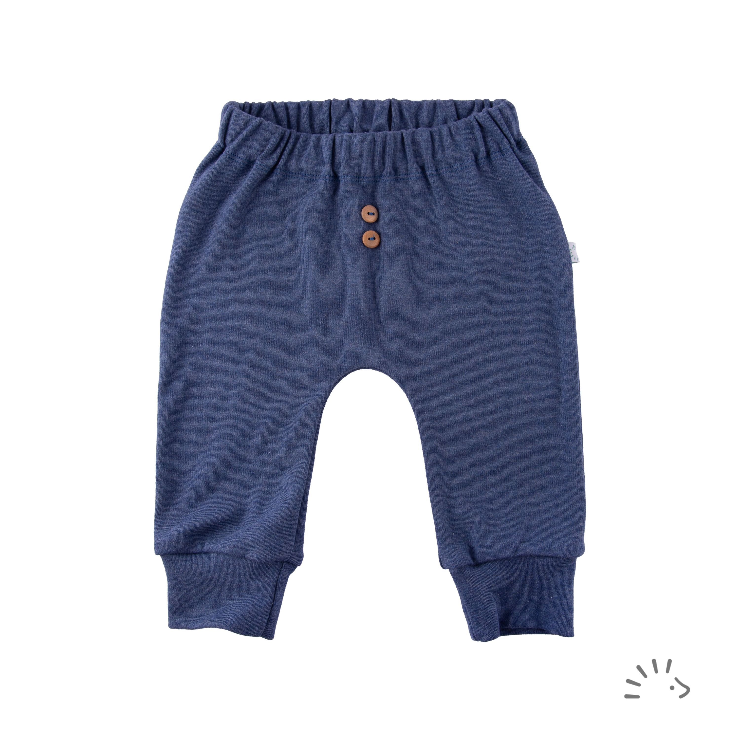 The soft belly elastic provides optimal support without pinching. A practical little opening allows you to easily reduce the elastic and adjust it to your child's individual needs. Two wooden buttons are attached to the front of the pants as a cute detail. The generous cut of the pants is ideal, providing enough room for cloth diapers , allowing your baby to kick freely .