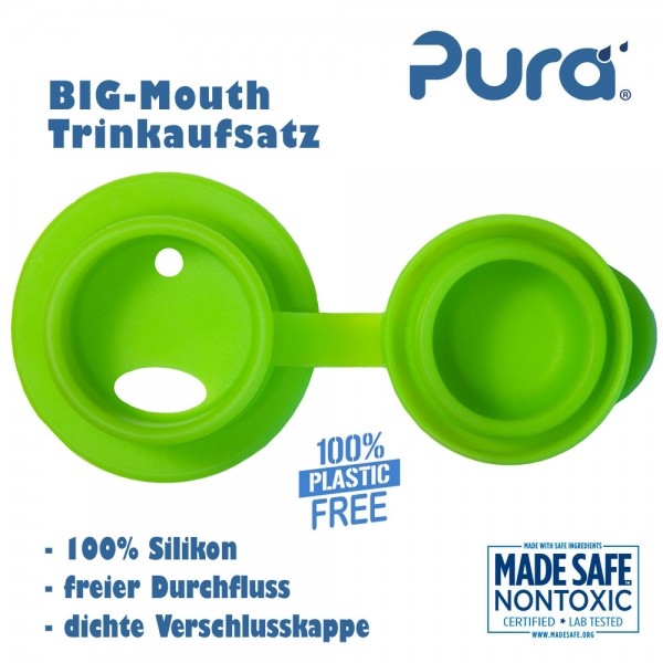 The Big Mouth Silicone Sport Cap fits any Pura bottle size and you can use it great for cycling, climbing, hiking, etc.