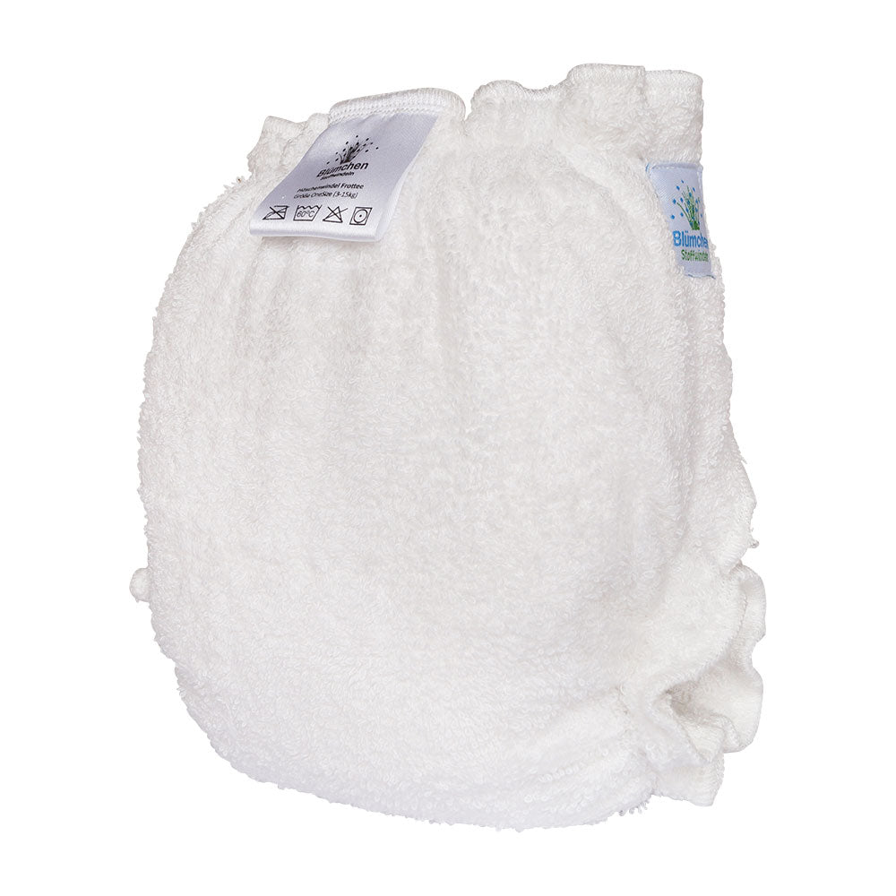 Beachte, dass diese Windel nicht dicht ist sondern lediglich aus Saugmaterial besteht, darum benötigst du eine passende Überhose darüber wie zum Beispiel die One-Size Überhose von Blümchen